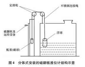 ①通過(guò)計(jì)算浮力和配重,在槽體頂部合適位置安裝定滑輪,在槽外合適位子安裝磁翻板傳感裝置;