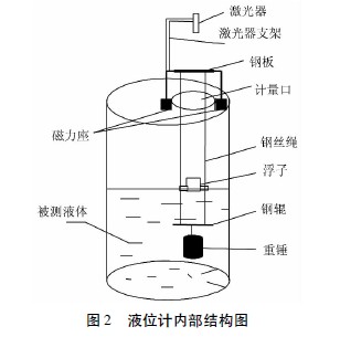 該方案的設計結構圖如圖2所示。它主要由雙頻激光干涉儀、雙浮子(內(nèi)設錐體棱鏡)、導向鋼絲繩等組成。激光器和浮子用于液位測量。
