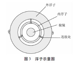 采用雙浮子結構,由內(nèi)外兩浮子組成,內(nèi)浮子含有錐體棱鏡,外浮子與內(nèi)浮子相連以固定內(nèi)浮子,減少液位變化時內(nèi)浮子的晃動,如圖3所示。另外該浮子與傳統(tǒng)的浮子式液位計不同,傳統(tǒng)的浮子式液位計的浮子是由測量鋼絲繩懸掛著,而該浮子是沿著導向鋼絲繩自由地隨著液位的升降而上下運動,減小了傳統(tǒng)浮子式液位計存在的機械傳動誤差和鋼絲繩張力對測量數(shù)據(jù)的影響。