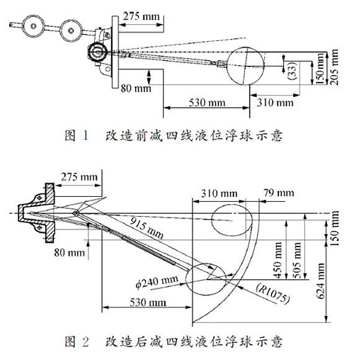 針對減四線液位測量進(jìn)行大轉(zhuǎn)角、切割集油箱改造,有效量程大于設(shè)計(jì)量程的80%,其改造測繪圖如圖2所示。改造后,安裝支架120 mm,插入深度為1 155mm,實(shí)際測量液位達(dá)450mm,儀表接液部位全部選用317材質(zhì)。轉(zhuǎn)軸—杠桿套筒、杠桿套筒—連桿、浮球—連桿的固定連接節(jié)點(diǎn)及加工焊接坡口增加焊接強(qiáng)度;對于活動節(jié)點(diǎn),采用專用銷子固定。