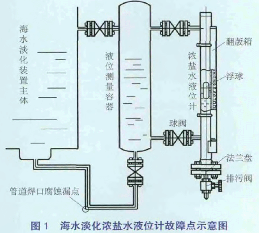 2013年12月16日0:20海淡水化裝置主體U3濃鹽水液位計開始出現(xiàn)30%~70%的波動,檢查液位計本體無異常,將液位計上、下閥門關小后,液位測量波動減小,但故障現(xiàn)象并未消失。利用高爐休風機會降海水淡化U3 主體負荷并查找故障原因。將液位計上、下閥門全關閉并拆下下部絲堵,打開排污閥徹底進行排氣排污處理,檢測磁性浮子,未發(fā)現(xiàn)異常。當投運后波動現(xiàn)象存在。濃鹽水液位計更換后再次試投運,發(fā)現(xiàn)液位計液位顯示波動更大、更頻繁。經過排查發(fā)現(xiàn)與液位測量容器(見圖1)連接的管道焊接處有漏點,對該漏點進行封堵后液位測量顯示恢復穩(wěn)定,負荷狀態(tài)生產恢復正常。