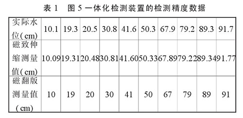 我們把圖5所示的一體化檢測裝置進行了水位檢測實驗,其檢測結果與實際水位值見表