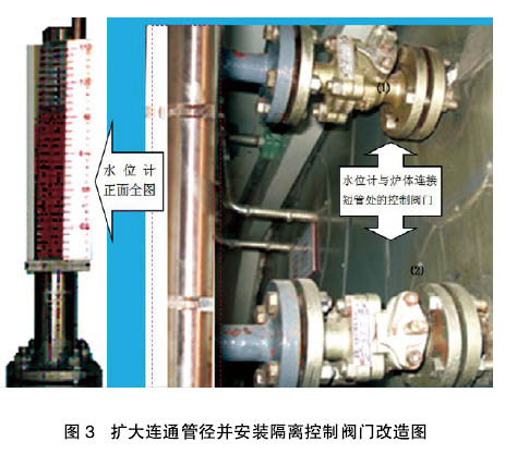 將水位計與爐體之間連通管山原來的ch16mm更換為ch20mm的管段,并安裝兩個控制閥門,通過關(guān)閉閥門(1)和(2),實(shí)現(xiàn)水位計與爐體隔離(l圖3)。這樣,拆卸水位計時既小需要排低爐水,也避免了對加熱爐真空度的影響。