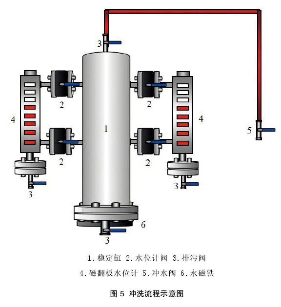 (2)拆下永磁鐵關(guān)閉4個水位計閥,打開穩(wěn)定缸上、下閥及閥門5,單獨(dú)沖洗主穩(wěn)定缸。