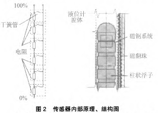 傳感器的作用是采樣液位高低位置并轉換成標準信號傳送至控制室,傳感器實際由干簧管和電阻組成。當浮子內(nèi)磁鋼位置變化后,磁場通過器壁帶動傳感器內(nèi)干簧管觸點吸合。干簧管吸合的位置決定回路的阻抗大小,干簧管的通常位置為10mm1組?;芈返拇笮≌门c液位的高低成正比,這樣*后由置于傳感器外殼內(nèi)的變送器將電阻信號轉換成標準的電流信號,送至控制室。具體結構、原理圖見圖2。