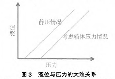 針對設備的故障,技術人員采取了更換多種質量好的磁感應開關(如耐高溫型等),以及基于磁翻板的外貼式模擬量液位控制,但效果均不理想。其他液位測量(如超聲波等)造價較高,而且需要對設備進行相應的改造,并且停運一段時間,而該系統(tǒng)屬于公用,上述條件均無法滿足。既要實現(xiàn)自動控制,又要相應允許實施。技術人員再次結合系統(tǒng)圖進行了分析:該水位溢流處和下限處范圍還是比較寬裕,而且箱體為非承壓容器,所以箱體內(nèi)的壓力和大氣壓相差不大,即便是有也基本上保持恒定,結合原水位測量的結構,考慮在帶報警開關磁翻板液位計的液位測量筒下部加裝1臺壓力變送器,在箱體壓力不是很大且基本恒定的情況下,液位與壓力值基本成對應關系(只是在現(xiàn)場修正疊加一個常數(shù)值來消除箱體上不恒壓所帶來的偏差)。液位與壓力的關系曲線見圖3。