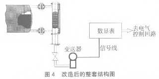 在外配1塊可輸出開關量接點的模擬量顯示儀表,這樣可實現(xiàn)液位的自動控制,集體的偏差多少可以在就實際進行整定試驗。整套測量系統(tǒng)的結構圖見圖4。