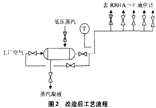 此次試驗(yàn)的成功為徹底解決乙烯球罐磁翻板結(jié)冰提供了寶貴的經(jīng)驗(yàn),因此將試驗(yàn)期間所用的臨時(shí)管線和設(shè)備經(jīng)過(guò)進(jìn)一步完善,于2016年4月底完成全部乙烯球罐(R301A-F)耐酸堿磁翻板液位計(jì)的改造,液位計(jì)上的空氣吹掃管為自制設(shè)備,進(jìn)氣端裝一閥門用于調(diào)節(jié)空氣量,另一端封閉,在靠進(jìn)液位計(jì)翻板側(cè)每間斷開(kāi)5cm一個(gè)中的孔用于空氣吹掃為保證吹掃空氣的溫度在加熱器出入口增加一旁線,流程見(jiàn)圖2。