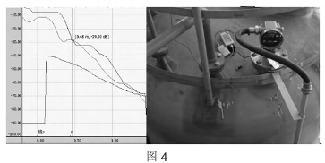 圖4為鹽酸配置槽正在加稀釋水且液位達到2.7m(量程3m)時回波包絡線圖。此時,測量值跳動明顯。分析原因:雷達液位計無明顯回波信號,且回波信號波動較大。該液位計在中低液位計加料時,測量值準確、穩(wěn)定,但高液位加稀釋水時,加料口距離雷達液位計距離過近,飛濺起的水花對回波產(chǎn)生了較大的干擾,從而影響了測量。