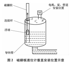 圖 2 中, B 點(diǎn)靠近電機(jī)和泵, 蒸餾水液位計(jì)安裝在此處既影響電機(jī)及泵的檢修, 又因泵附近液位的環(huán)流波動(dòng)較大, 對(duì)浮子導(dǎo)向管沖刷嚴(yán)重, 故 B 點(diǎn)不合理; C 點(diǎn)處因有管道通過, 不便維護(hù)且影響管道和泵、 電機(jī)等的起吊更換, 故也不能選擇 C 點(diǎn); A 點(diǎn)遠(yuǎn)離泵和電機(jī), 且有足夠的空間安裝翻板, 便于維護(hù),所以 A 點(diǎn)較為合適。
