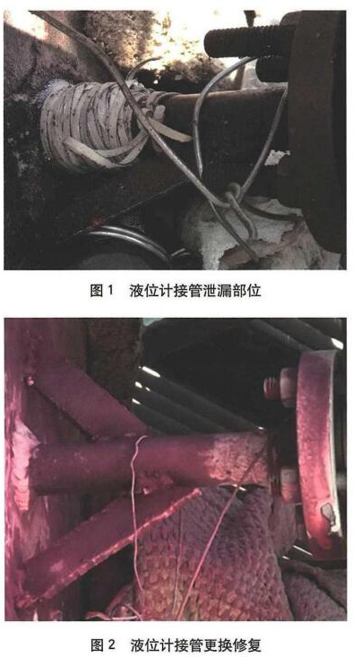 圖1是分離罐液位計(jì)接管泄漏部位,圖2則是停工搶修更換并經(jīng)檢查合格的襯四氟磁翻板液位計(jì)接管。泄漏發(fā)生在襯四氟磁翻板液位計(jì)接管靠近罐體部位(臨時(shí)用白色膠帶纏繞處),修復(fù)后的襯四氟磁翻板液位計(jì)接管仍釆用原設(shè)計(jì)結(jié)構(gòu),但接管壁厚增加,變更為必25x4mm。