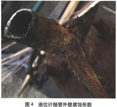 分離罐液位計(jì)接管先于罐體腐蝕泄漏失效是由于管壁較薄加之外表面防腐保溫不完整導(dǎo)致雨水侵人常年腐蝕所致。對(duì)此應(yīng)引起設(shè)計(jì)、制造、使用及檢驗(yàn)等相關(guān)各方為戒。