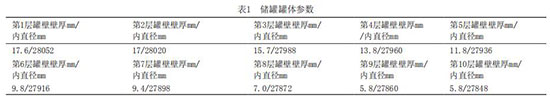 (1)改造前對(duì)儲(chǔ)罐的罐體進(jìn)行了超聲波測(cè)厚以及材料的化學(xué)成分及性能分析,其材質(zhì)滿足現(xiàn)行的使用條件,其儲(chǔ)罐的罐體參數(shù)及每層罐壁的厚度(實(shí)測(cè))見(jiàn)表1,罐壁的每層壁板高度為1690mm,其搭接寬度為40mm,縱焊縫為對(duì)接結(jié)構(gòu),見(jiàn)表1。