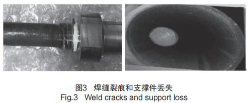 在歷次大修執(zhí)行 GSS 系統(tǒng) MSR 熱水箱液位計預(yù)防性維修檢查時發(fā)現(xiàn),部分導(dǎo)波桿支撐件破碎并丟失,同時存在探桿根部焊縫有裂痕的問題,見圖 3 焊縫裂痕和支撐件丟失。