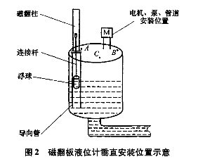 圖2中,B點(diǎn)靠近電機(jī)和泵,襯四氟磁翻板液位計安裝在此處既影響電機(jī)及泵的檢修,又因泵附近液位的環(huán)流波動較大,對浮子導(dǎo)向管沖刷嚴(yán)重,故B點(diǎn)不合理;C點(diǎn)處因有管道通過,不便維護(hù)且影響管道和泵、電機(jī)等的起吊更換,故也不能選擇C點(diǎn);A點(diǎn)遠(yuǎn)離泵和電機(jī),且有足夠的空間安裝翻板,便于維護(hù),所以A點(diǎn)較為合適。