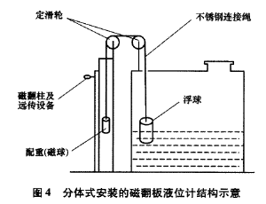 分體式襯四氟磁翻板液位計的安裝步驟如下:①通過計算浮力和配重,在槽體頂部合適位置安裝定滑輪,在槽外合適位子安裝磁翻板傳感裝置;②用直徑為3mm的不銹鋼繩連接浮子和配重,鋼繩長度根據(jù)液位來計算。這里特別要注意,磁翻板要反向安裝。