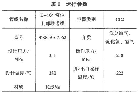 該裝置于2016年9月開工轉(zhuǎn)人正常運行,2016年9月7日發(fā)現(xiàn)D-104液面計上引出線有冒油氣現(xiàn)象,現(xiàn)場檢查發(fā)現(xiàn)D-104液面計上接管引出線法蘭后焊縫靠上部有裂紋現(xiàn)象,車間對泄漏部位進行帶壓鉚擊消漏處理。9月8日該部位再次出現(xiàn)泄漏,裝置停工隔離處理(表1)。