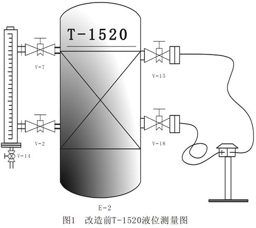原T-1520液位測(cè)量為下圖1所示,左側(cè)為液化石油氣液位計(jì),右側(cè)為雙法蘭磁性浮子液位計(jì)。