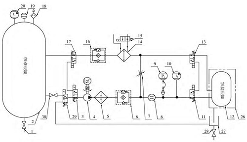油液循環(huán):當(dāng)*次試驗(yàn)補(bǔ)油完成后,L 形三通電動(dòng)閥(3、17、11、13)切換工作位置,油液經(jīng)油泵 (4)、加熱器(5)、供油過濾器(6)、流量計(jì)(8)、L 形三 通電動(dòng)閥(11)、 被測(cè)油箱(12)、L 形三通電動(dòng)閥(13)、油水換熱器(14)、 回油過濾器(16)、L 形三通電動(dòng)閥(17、3、29)后,此時(shí)油液不回到設(shè)備油箱,而是直接進(jìn)入油泵吸油口,形成一個(gè)閉式循環(huán)系統(tǒng)。系統(tǒng)中流量計(jì)始終檢測(cè)當(dāng)前閉式系統(tǒng)供給被測(cè)油箱的流量,閉式系統(tǒng)的優(yōu)點(diǎn)在于始終保持被測(cè)油箱中的油液的位置。