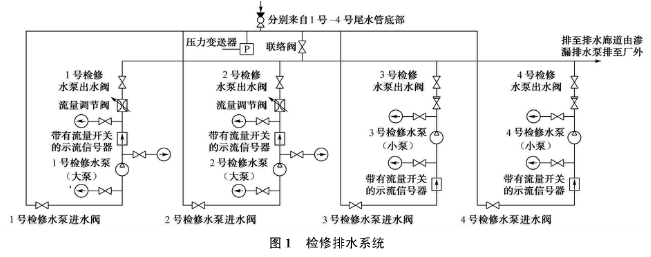 桐柏電站的檢修排水系統(tǒng),共設(shè)4臺(tái)排水泵,如圖1所示,1號(hào)、2號(hào)檢修水泵(大泵)用于排空引水隧洞、蝸殼、尾水管、尾水隧洞內(nèi)的水;3號(hào)、4號(hào)檢修水泵(小泵)用于球閥、上下庫(kù)閘門等的滲漏排水。每臺(tái)檢修水泵均配置逆止閥、壓力表和帶流量開關(guān)的示流信號(hào)器,在1號(hào)、2號(hào)水泵出水管處各安裝了一個(gè)流量調(diào)節(jié)閥。系統(tǒng)中共有2根總管,一根為水泵的總吸水管,包括從每臺(tái)機(jī)組尾水管底部至總管的支管,總吸水管和部分支管及管路上的操作閥門布置在廠房管路廊道中;另一根為總排水管,可將水排至滲漏集水井中,再經(jīng)滲漏排水泵排至下庫(kù)。