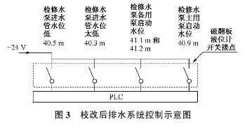 它結(jié)構(gòu)是利用旁通管的原理,主導(dǎo)管內(nèi)的液位和尾水管內(nèi)的液位高度一致,根據(jù)阿基米德定理,磁性浮子在液體中產(chǎn)生的浮力和重力平衡,當(dāng)尾水管中的水位升降時(shí),液位計(jì)主導(dǎo)管內(nèi)的浮子也隨之升降,浮子內(nèi)的永久磁鐵通過(guò)磁耦合驅(qū)動(dòng)指示器內(nèi)的翻板指示器,當(dāng)液位上升或下降時(shí),翻板指示器由白色翻轉(zhuǎn)為紅色,或由原來(lái)的紅色翻轉(zhuǎn)為白色,指示器的顏色改變的高度就是被測(cè)水位的實(shí)際高度,從而實(shí)現(xiàn)液位的現(xiàn)場(chǎng)指示,以供運(yùn)行人員目測(cè)尾水管的實(shí)時(shí)水位。安裝于液位計(jì)管壁外側(cè)的磁記憶開關(guān),可多點(diǎn)設(shè)置、滑動(dòng)調(diào)整位置,提供了液位開關(guān)量報(bào)警功能。在裝置的頂部安裝了一個(gè)自動(dòng)排氣裝置,當(dāng)主導(dǎo)管內(nèi)液位上升時(shí)能夠自動(dòng)的排氣,下降時(shí)能夠按時(shí)補(bǔ)氣?,F(xiàn)場(chǎng)安裝耐高溫磁翻板液位計(jì)時(shí),裝置標(biāo)尺的0位,對(duì)應(yīng)的實(shí)地高程為EL.40.0m。浮子開關(guān)設(shè)定5個(gè)水位動(dòng)作值,檢修水位低開關(guān)量報(bào)警值對(duì)應(yīng)的高程為40.3m;停止所有檢修水泵的開關(guān)量,所對(duì)應(yīng)的高程為40.5m;啟動(dòng)主用檢修水泵的開關(guān)量,所對(duì)應(yīng)的高程為40.9m;啟動(dòng)檢修水泵主用泵的開關(guān)量,以及要求手動(dòng)啟動(dòng)大泵,并作為水位高報(bào)警上送上位機(jī),所對(duì)應(yīng)的高程為41.1m與41.2m,兩個(gè)開關(guān)量并列接入。全部開關(guān)量分別送入PLC,如圖3所示。