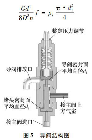 忽略重力和摩擦力因素的影響,對(duì)導(dǎo)閥的動(dòng)作過程進(jìn)行受力分析,導(dǎo)閥結(jié)構(gòu)如圖 5 所示。當(dāng)系統(tǒng)壓力升高達(dá)到整定壓力時(shí),氣體在導(dǎo)閥密封面處克服導(dǎo)閥彈簧預(yù)緊力向上頂起導(dǎo)閥的閥芯,此時(shí)應(yīng)滿足:
