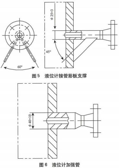 圖5是泄漏丙酸液位計(jì)接管結(jié)構(gòu),雖然必25mmx35mm接管的開孔補(bǔ)強(qiáng)滿足GB150-1989標(biāo)準(zhǔn)[11“開孔不另行補(bǔ)強(qiáng)”的要求,但卻不符合現(xiàn)行標(biāo)準(zhǔn)GB/T150-2011的“開孔不另行補(bǔ)強(qiáng)”要求。因?yàn)?,兩?biāo)準(zhǔn)雖然限制的設(shè)計(jì)壓力(<2.5MPa)與接管外徑(<89mm)等條件相同,但是后者改版標(biāo)準(zhǔn)卻對(duì)接管壁厚及腐蝕裕量增加了要求,這是合理的改進(jìn)完善。對(duì)于本例的425mm接管,滿足GB/T150-2011的“開孔不另行補(bǔ)強(qiáng)”條件的管壁厚度至少應(yīng)為5.5mm(按標(biāo)準(zhǔn)規(guī)定當(dāng)腐蝕裕量為1mm時(shí),接管厚度應(yīng)不小于3.5mm)。所以,按HG/T20583-2011對(duì)小接管避免彎曲而推薦的加強(qiáng)結(jié)構(gòu)優(yōu)先選用加強(qiáng)管形式建議將液位計(jì)接管更改為圖6的加強(qiáng)管結(jié)構(gòu)。這樣不但解決了小接管的開孔補(bǔ)強(qiáng)和防彎曲加強(qiáng)問題,也可以使小接管的設(shè)計(jì)使用年限與罐體一致,而且便于保證小接管與罐體采用插人式全焊透角焊縫的焊接質(zhì)量。