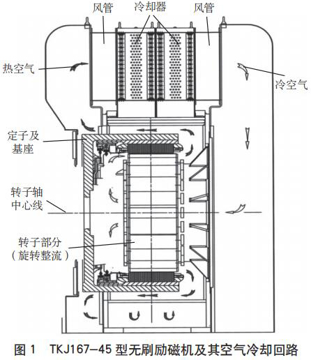 某核電廠的勵(lì)磁機(jī)采用ALSTOM生產(chǎn)的TKJ167-45 型無(wú)刷勵(lì)磁機(jī),該型號(hào)的勵(lì)磁機(jī)采用循環(huán)空氣冷卻,兩臺(tái)空氣冷卻器并排安裝在勵(lì)磁機(jī)的正上方,冷卻空氣在冷卻器、風(fēng)管以及勵(lì)磁機(jī)外罩連接形成的閉合風(fēng)路中進(jìn)行強(qiáng)迫循環(huán),具體情況如圖 1 所示。