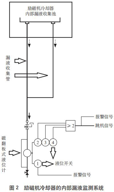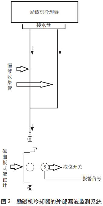 實(shí)際運(yùn)行經(jīng)驗(yàn)表明,側(cè)裝式磁翻板液位計(jì)內(nèi)部銅管發(fā)生泄漏的概率較低,但一旦發(fā)生泄漏,漏液會(huì)隨著冷卻空氣沿閉合風(fēng)路進(jìn)入勵(lì)磁機(jī)內(nèi)部,造成勵(lì)磁機(jī)短路損壞的嚴(yán)重后果。為了保證機(jī)組安全,應(yīng)有冷卻器內(nèi)部銅管泄漏監(jiān)測(cè)裝置,然而現(xiàn)場(chǎng)沒(méi)有配置此類(lèi)裝置。