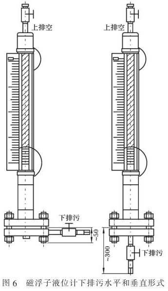 以常用防腐磁翻柱液位計為例。 此類液位計安裝時,一般選用側-側連接方式,帶放空和排污。因此, 應根據(jù)預留空間, 決定放空或排污采用垂直(常用)或水平的安裝形式,如圖 6 所示。