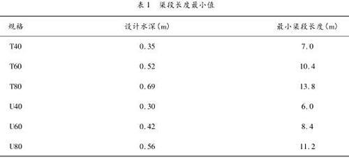 根據《灌溉渠道系統量水規(guī)范》(GB/T 21303 -2007),設置標準斷面的渠段長度,應大于 20 倍*大水深。定型斷面量水渠槽的渠段長度如表 1 所示。