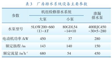 呼蓄電站廠房排水系統(tǒng)包括地下廠房滲漏排水系統(tǒng)、機組檢修排水系統(tǒng)。地下廠房滲漏排水系統(tǒng)設(shè)有1個滲漏集水井,有效容積364 m 3 ,設(shè)5臺滲漏排水泵,3運2備,系統(tǒng)*大滲漏總排水量為2250m 3 /h。滲漏排水泵正常運行時由廠內(nèi)滲漏排水控制盤PLC或監(jiān)控系統(tǒng)自動控制啟停,也可就地通過每臺泵的啟動柜手動啟停。自動控制時整定水位見表2。廠房排水系統(tǒng)設(shè)備主要參數(shù)見表3。
