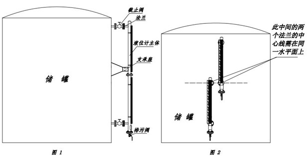 (9)對于超長型磁翻板液位計(測量范圍大于4m),物流運(yùn)輸成本較高,一般進(jìn)行分段制作。分段方法有以下兩種形式,可根據(jù)客戶現(xiàn)場設(shè)備的實際接口形式而定。圖1形式是將一臺磁翻板液位計分成兩段,安裝時先組裝對接好連接法蘭,在進(jìn)行對接操作時可適當(dāng)松開顯示面板,支承點的數(shù)量根據(jù)磁翻板液位計的長短來定。圖2形式是分成兩臺或若干臺獨立的磁翻板液位計,這種形式的結(jié)構(gòu)要求儲罐中間的兩塊法蘭的中心線處在同一水平面上,以實現(xiàn)液位顯示的連續(xù)性。