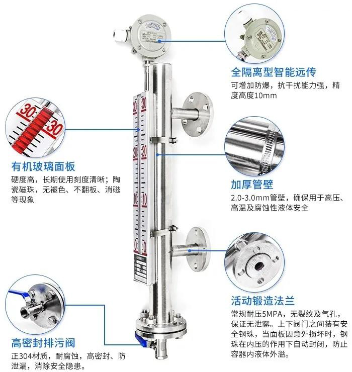 磁翻柱液位計(jì)是根據(jù)連通器和帶磁藕合基本原理而工作中的。做為一種普遍的液位儀檢測儀表,被普遍用于石油化工設(shè)備、倉儲(chǔ)物流運(yùn)送等制造行業(yè)對各種各樣儲(chǔ)槽、儲(chǔ)罐、球形器皿和加熱爐等機(jī)器設(shè)備內(nèi)的物質(zhì)開展液位儀檢驗(yàn)。相關(guān)磁翻柱液位計(jì)的基本原理,大家都廣為人知,但對其構(gòu)造和特性卻了解很少。那麼,磁翻柱液位計(jì)的構(gòu)造構(gòu)成和特性有什么呢?