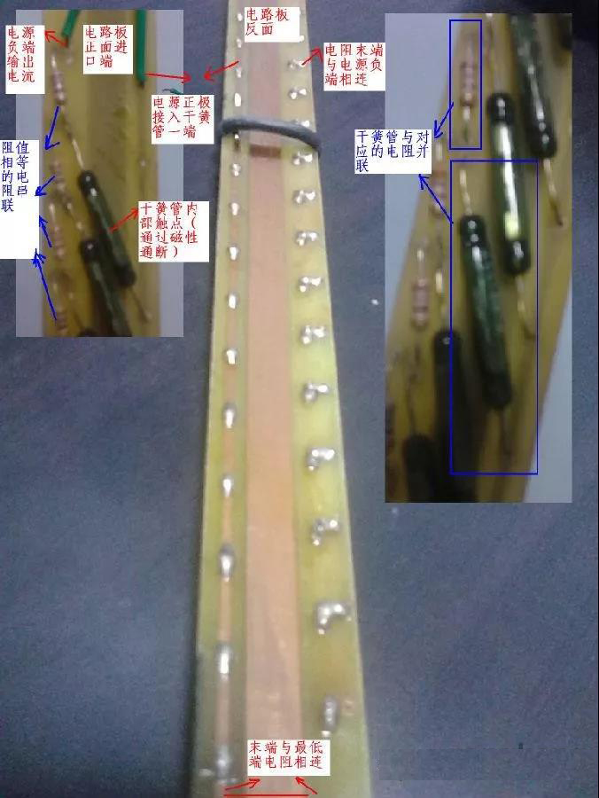 電阻測(cè)量電路板安裝在一個(gè)不銹鋼的護(hù)套管內(nèi),電路板由相同阻值的電阻串聯(lián)而成,每個(gè)電阻的末端與電路板電源進(jìn)線間并聯(lián)一個(gè)干簧管,干簧管內(nèi)部有一個(gè)對(duì)磁性敏感的小觸點(diǎn),遇到磁浮子的磁性時(shí)觸點(diǎn)吸合,此干簧管以下的所有電阻被短路,電路板的電阻值變小使變送器輸出電流變大。磁浮子上升或下降后干簧管的觸點(diǎn)在釋放,此點(diǎn)的電阻恢復(fù)功能。