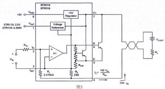 把傳感器輸出的不同電壓轉(zhuǎn)換成標(biāo)準的4-20ma輸出,可采用不同的電路形式。成本低的可采用分立器件,但是為了達到比較高的精度,要保證相應(yīng)器件的匹配程度,調(diào)試也比較麻煩。傳感器專用的4-20ma 的一體化變送器集成電路,采用該系列產(chǎn)品設(shè)計的變送器成本低,精度高,調(diào)試簡單。經(jīng)過選擇決定使用完成設(shè)計。內(nèi)部結(jié)構(gòu)如圖三: